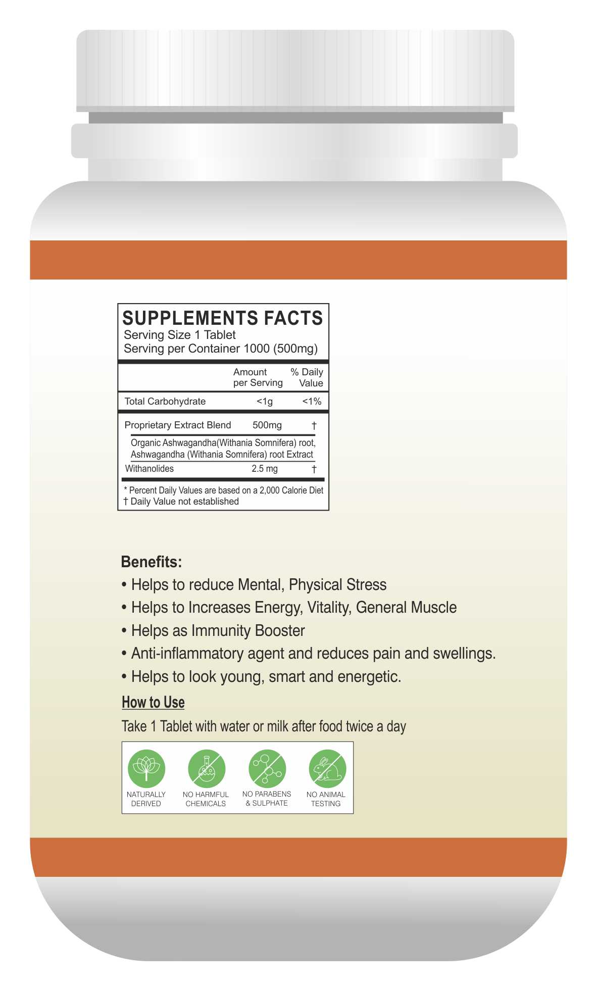 • Himalaya Ashvagandha is 100% vegetarian-Free from sugar, artificial colors, artificial flavors, and preservatives.